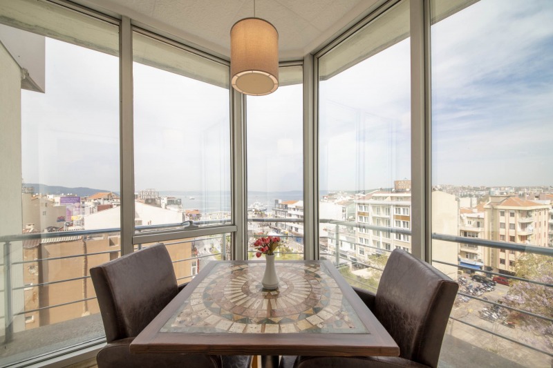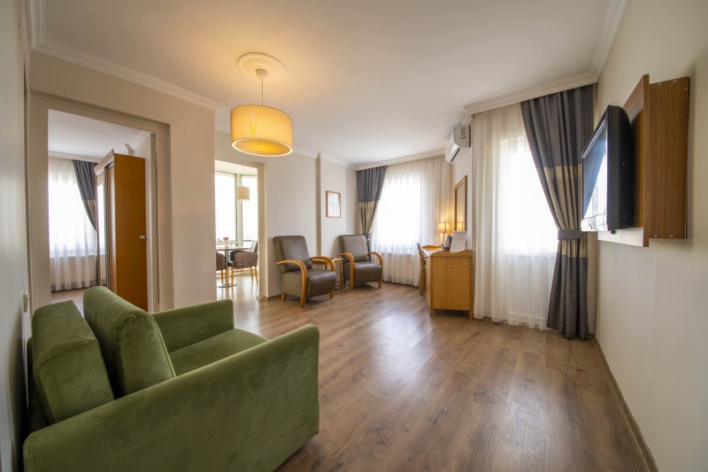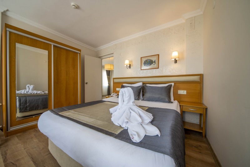 30 m² Deniz manzaralı suit odamız üç bölümden oluşmaktadır. İki kişilik geniş yataklı yatak odası, panoramik manzaralı cam köşe oda ve giriş hölü. Ayrıca odada 2 adet balkon mevcuttur.