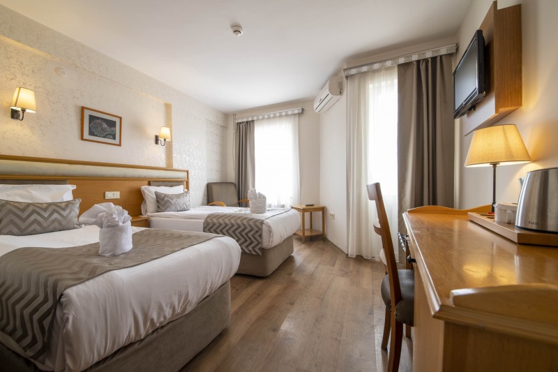 15 m² odamızda 2 tek kişilik yatak bulunmaktadır. Odada balkon mevcuttur. LED Ekran Televizyon, Kablosuz İnternet, Kasa, Split klima, Merkezi sistem ısıtma, saç kurutma makinası Su Isıtıcısı / Çay-Kahve Setup, Minibar (Ücretli) , Perke zemin, Balkon